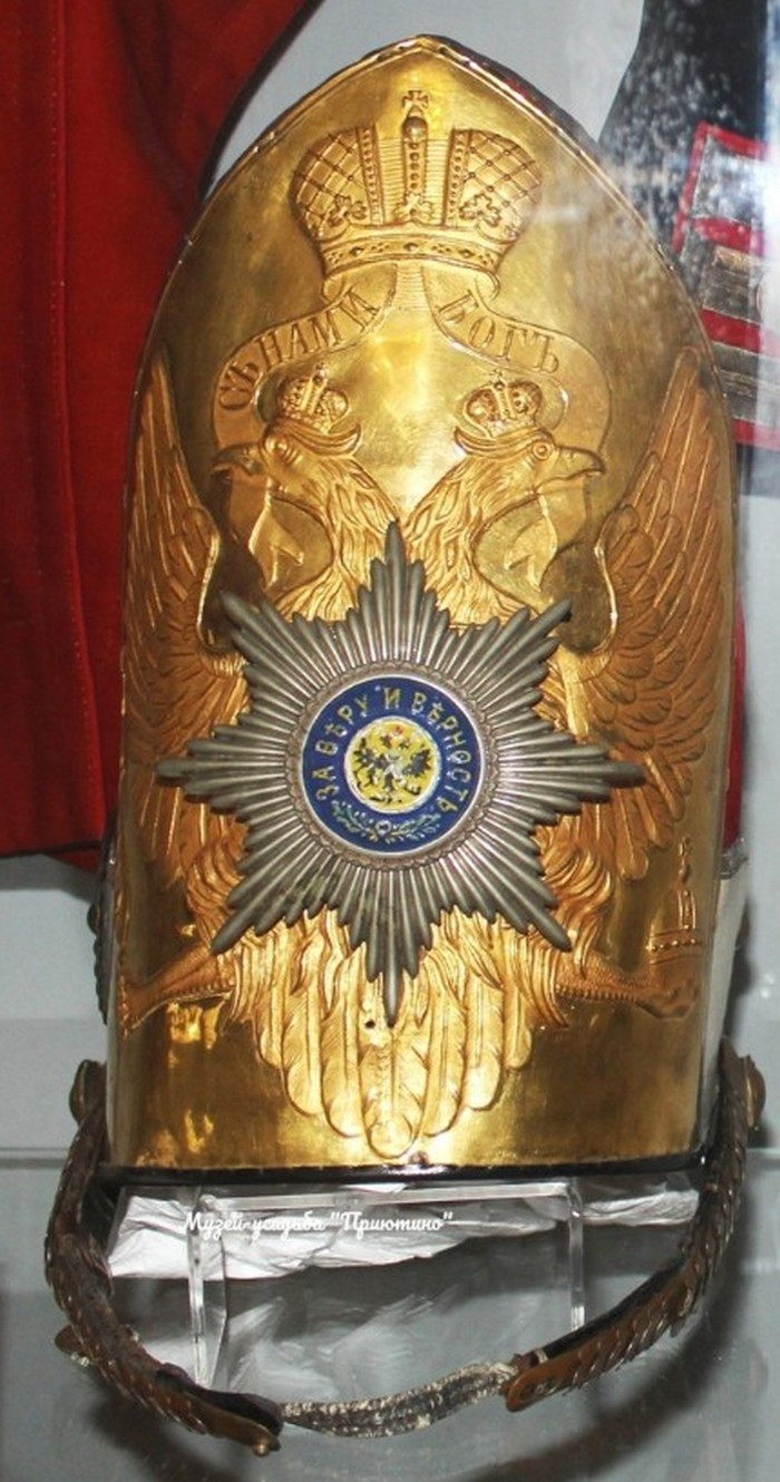 (Русские кирасиры и драгуны в эпоху Отечественной войны 1812 г. носили черную кожаную каску образца 1808 г. с плюмажем из черного конского волоса (у трубачей плюмаж был красный). На медном налобнике каски был выштампован герб: звезда ор­дена св. Андрея Первозван­ного — в Кавалергардском, л.- гв. Конном и л.-гв. Драгун­ском полках;