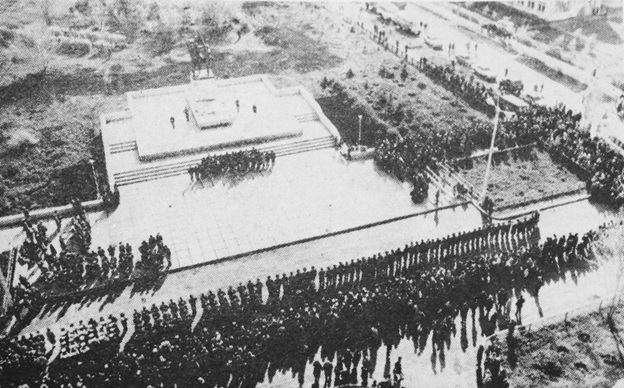 Митинг, посвященный 41-й годовщине Победы советского народа над фашистской Германией, открывает председатель исполкома городского Совета народных депутатов П. Я. Масютин.