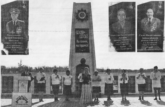 Почётное право открытия памятника было предоставлено главе администрации района Забиру Габдуллину и председателю общества «Дети войны» Галие Каримовой. Затем все собравшиеся возложили цветы, минутой молчания почтили память всех, кто приближал Великую Победу на фронтах и в тылу.