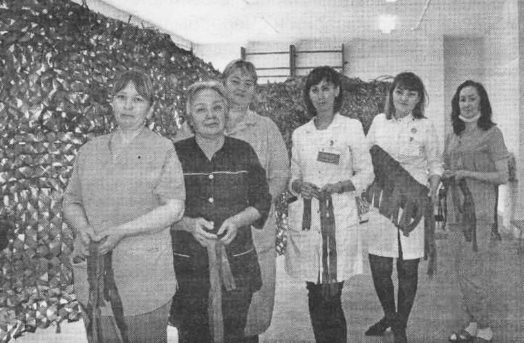 Ещё одним важным направлением ра­боты стало плетение маскировочных сетей. Счёт им давно потерян, только офи­циально учтённых — более 50. Последнюю, размером 3×6 м, создали сотрудники дет­ской поликлиники.