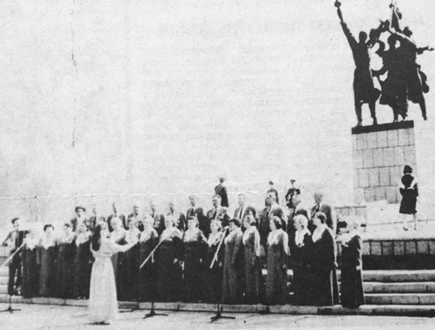 Залпы салюта. И мощно, величественно раздается окрест песня «Фронтовики, наденьте ордена!» в ис­полнении хора ветеранов. Потом вторая, третья… Праздник продолжается.