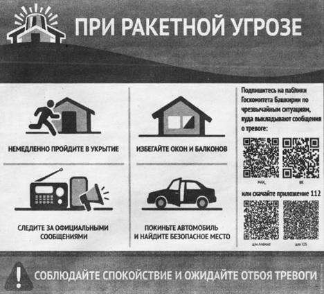 — Сигнал «Ракетная опасность» означает, что существует угроза нападения с применением ракет. Соответствующие структуры Министерства обороны фиксируют ракеты на территории Российской Федерации и своевременно проводят оповещение населения, чтобы граждане могли максимально себя обезопасить. Необходимо понимать, что ракета летит гораздо быстрее, чем беспилотник, поэтому времени на принятие решения гораздо меньше, а значит, необходимо принимать все меры максимально оперативно, — объясняет председатель Госкомитета Республики Башкортостан по чрезвычайным ситуациям Кирилл Первов.