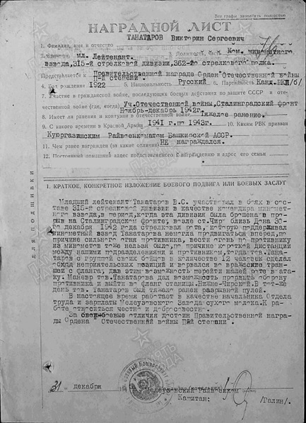 23 июня 1941 года я получил в военкомате направление в Симферопольское миномётное училище. В связи с тяжёлой обстановкой на юге страны нас досрочно выпустили и в августе сорок второго я, в звании младшего лейтенанта, направляюсь на Сталинградский фронт. Назначаюсь командиром миномётного взвода в 362 полк 315-й Сибирской стрелковой дивизии.